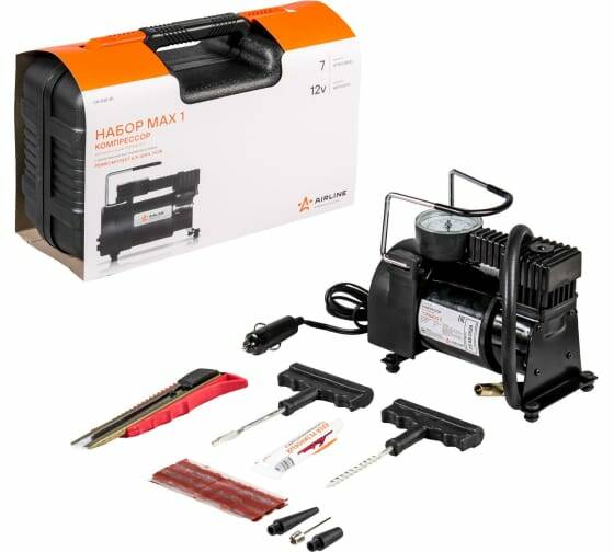 Компрессор AIRLINE TORNADO S с комплектом инструмента, в кейсе, ремкомплект для бескамерных шин, нож CA-020-01 предназначен для получения сжатого воздуха в дорожных условиях.