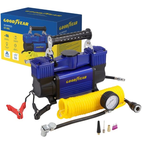 Автомобильный компрессор Goodyear GY-80L Мощный двухпоршневой автомобильный компрессор Goodyear GY-80L — незаменимый помощник в дороге для любого водителя. Устройство отлично справляется с накачиванием колес джипов, внедорожников, минивэнов, микроавтобусов и небольших грузовиков, а также надувных…