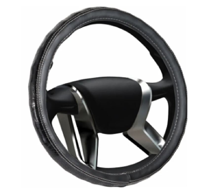 Оплетка на руль Senator «Arizona» предназначена для рулевых колес с внешним диаметром 37-39 см. Волнистый обод выполнен из эластичной резины, верх изготовлен из автомобильной экокожи в сочетании с винилом, стилизованным под крокодиловую кожу.